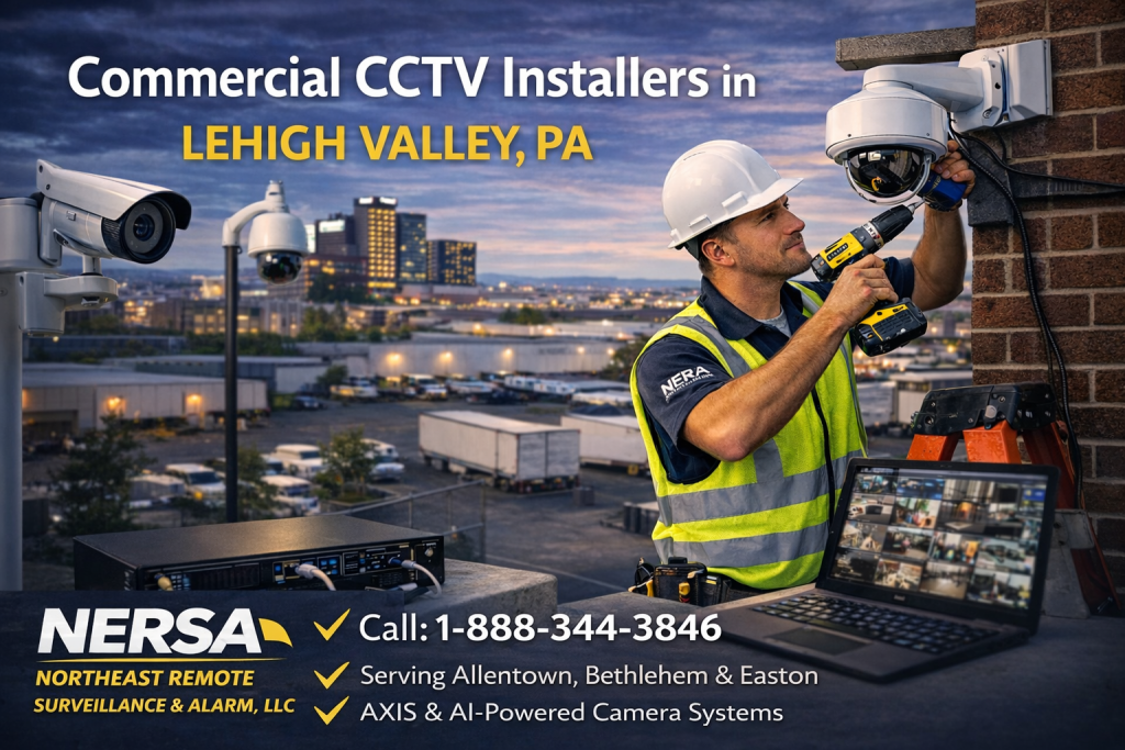 CCTV Installers in Lehigh Valley PA by Northeast Remote Surveillance and Alarm, LLC (NRSEC) is a leading commercial CCTV installer in Lehigh Valley, PA, delivering AI-enabled video surveillance (ai enabled video surveillance) systems and enterprise-grade recording solutions for businesses, industrial facilities, schools, healthcare organizations, warehouses, and municipal properties throughout Allentown, Bethlehem, Easton, Phillipsburg, and the Greater Lehigh Valley.